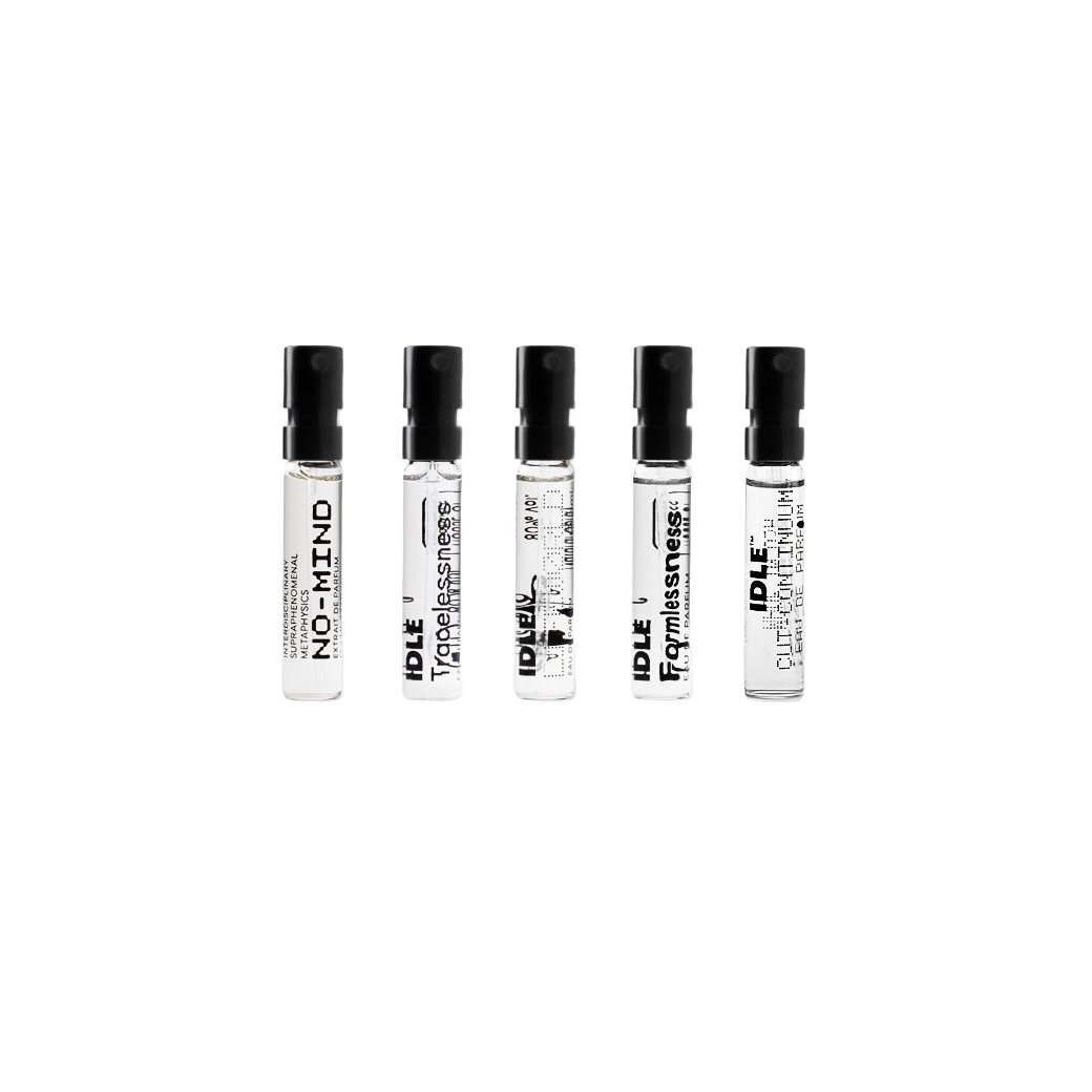 IDLE™’s collection, including scents such as No-Mind and Tracelessness, embodies this philosophy. No-Mind evolves from cool, metallic aldehydes to warm, woody incense and soft white musks, adapting uniquely to each wearer. Tracelessness is a luminous, almost imperceptible scent, both void and abundant, encouraging the wearer to inhabit a space of reflection and awareness. Each fragrance is an invitation—quiet, transformative, and deeply personal.